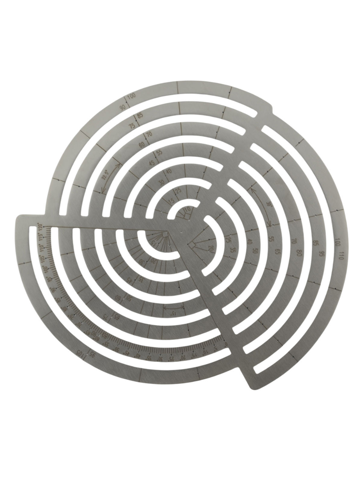 Изготовлена из нержавеющей стали толщиной 1,2 мм, с нанесенными величинами радиусов от 10 до 110 мм и углов от 0 до 120 градусов (через 15, 22.5, 30, 45). Линейка имеет шлифованные плоскости, которые не царапают кожу.