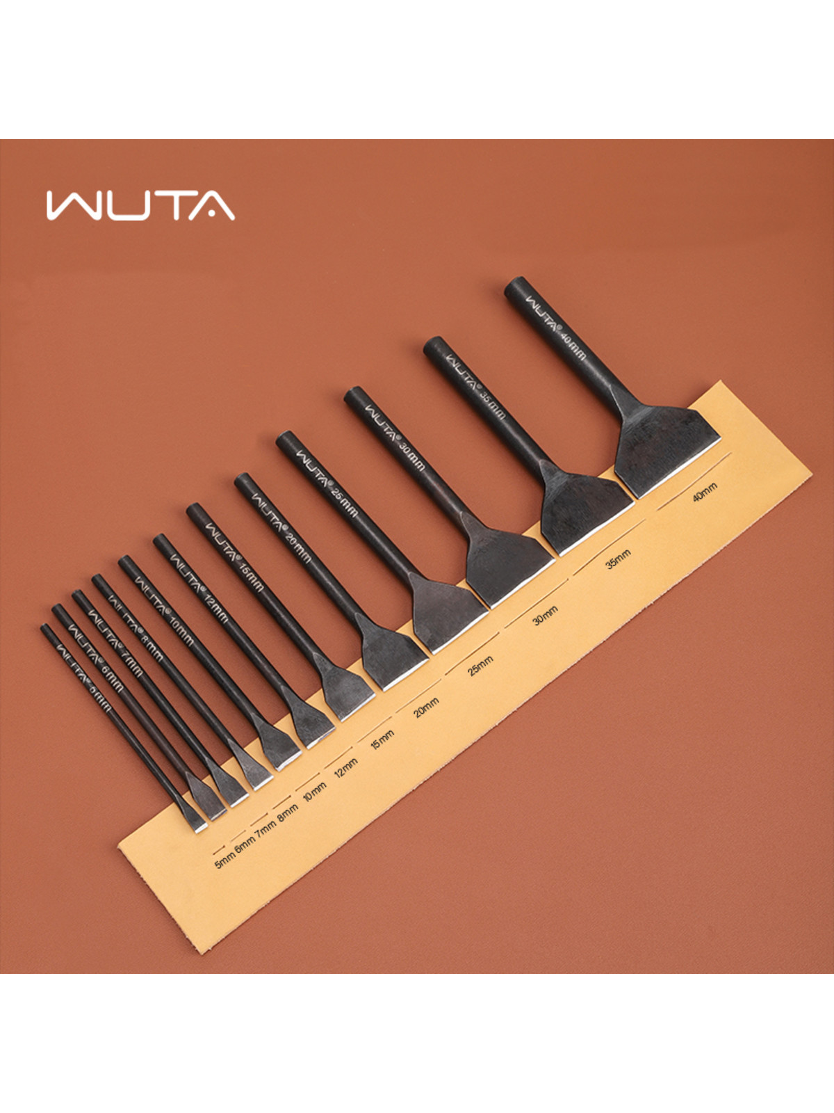 Набор плоских просечек Wuta разных размеров, предназначен для прорезки или вырубки отверстий в коже, картоне и прочих похожих материалах.