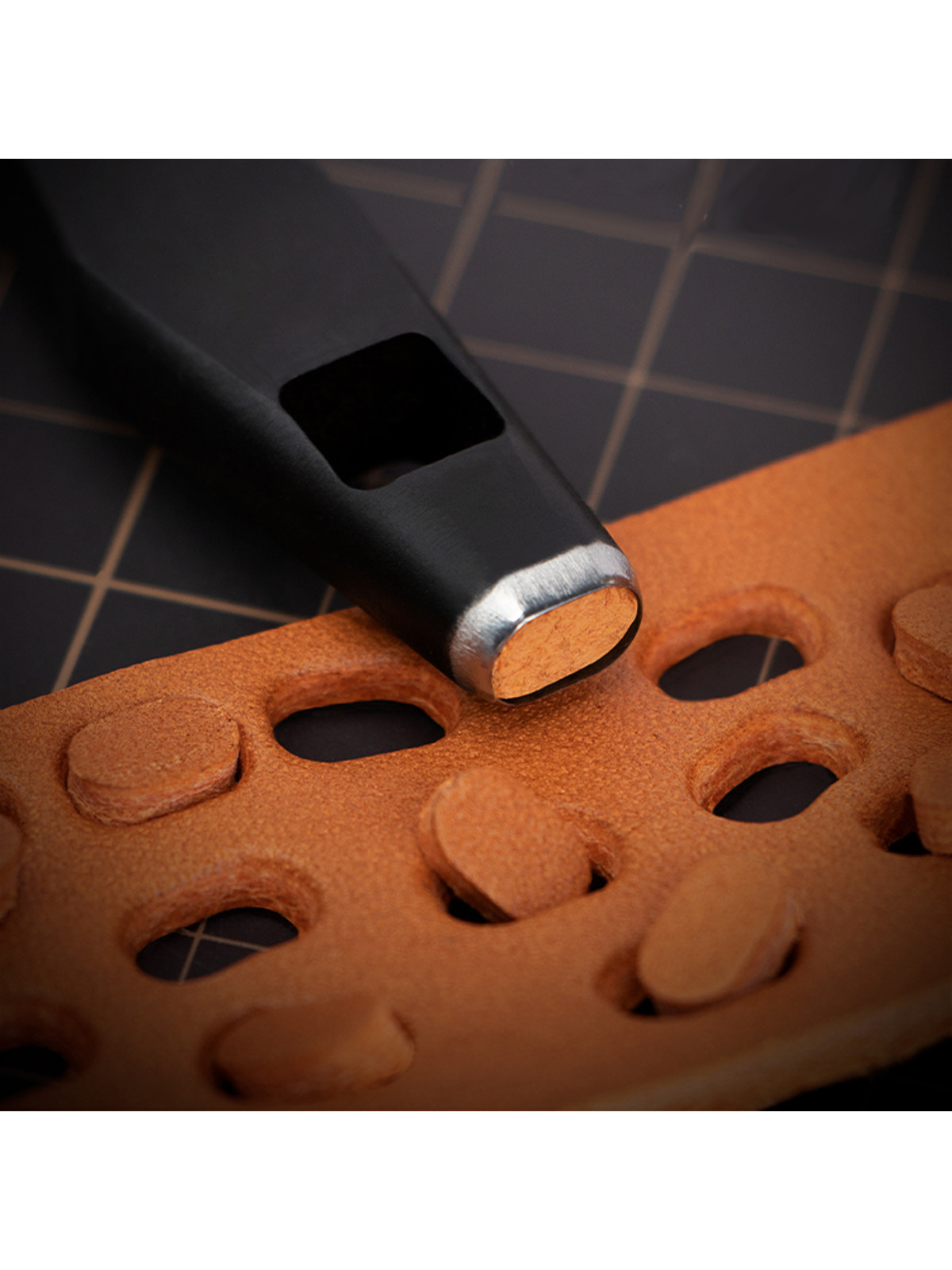 Овальный пробойник Wuta из инструментальной стали, с гладкой рабочей поверхностью. Идеальная форма режущей части пробойника, позволяет делать аккуратные отверстия в толстой коже. Используются в основном для получения овальных отверстий под язычок пряжки.