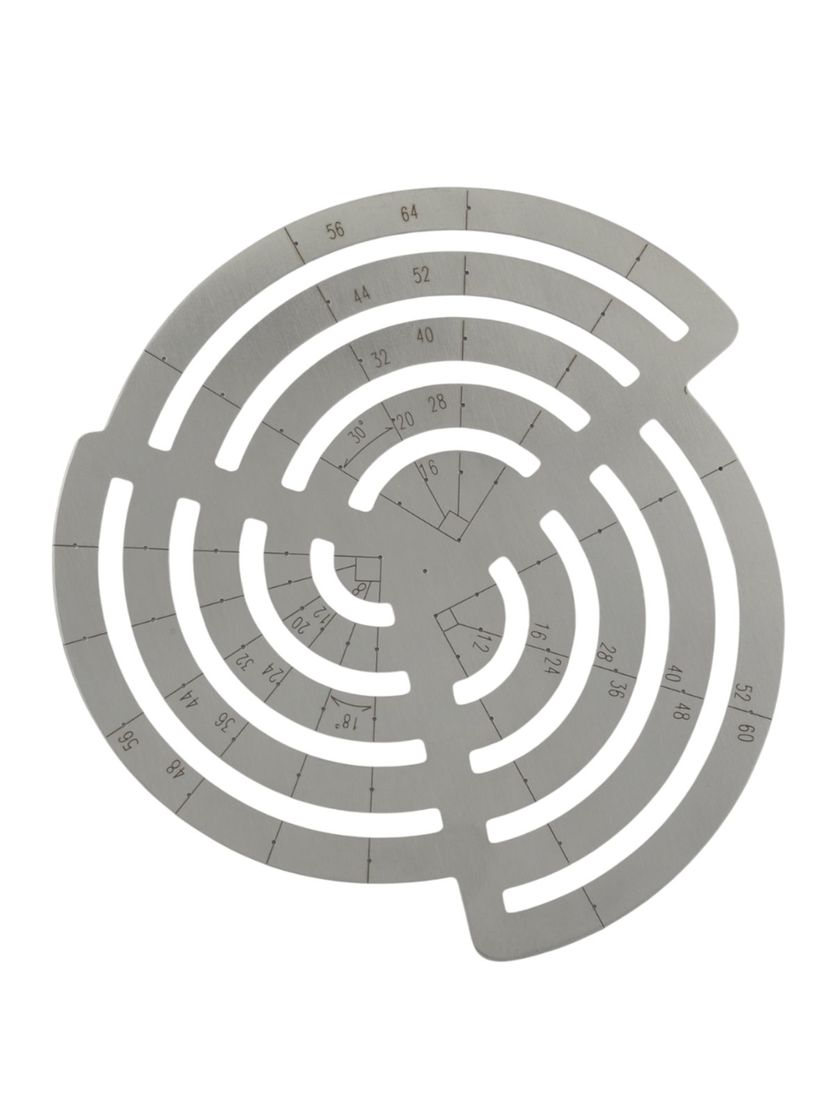 Изготовлена из нержавеющей стали толщиной 1,2 мм, с нанесенными величинами радиусов от 8 до 64 мм и углов от 0 до 90 градусов (через 18, 30, 45). Линейка имеет шлифованные плоскости, которые не царапают кожу.